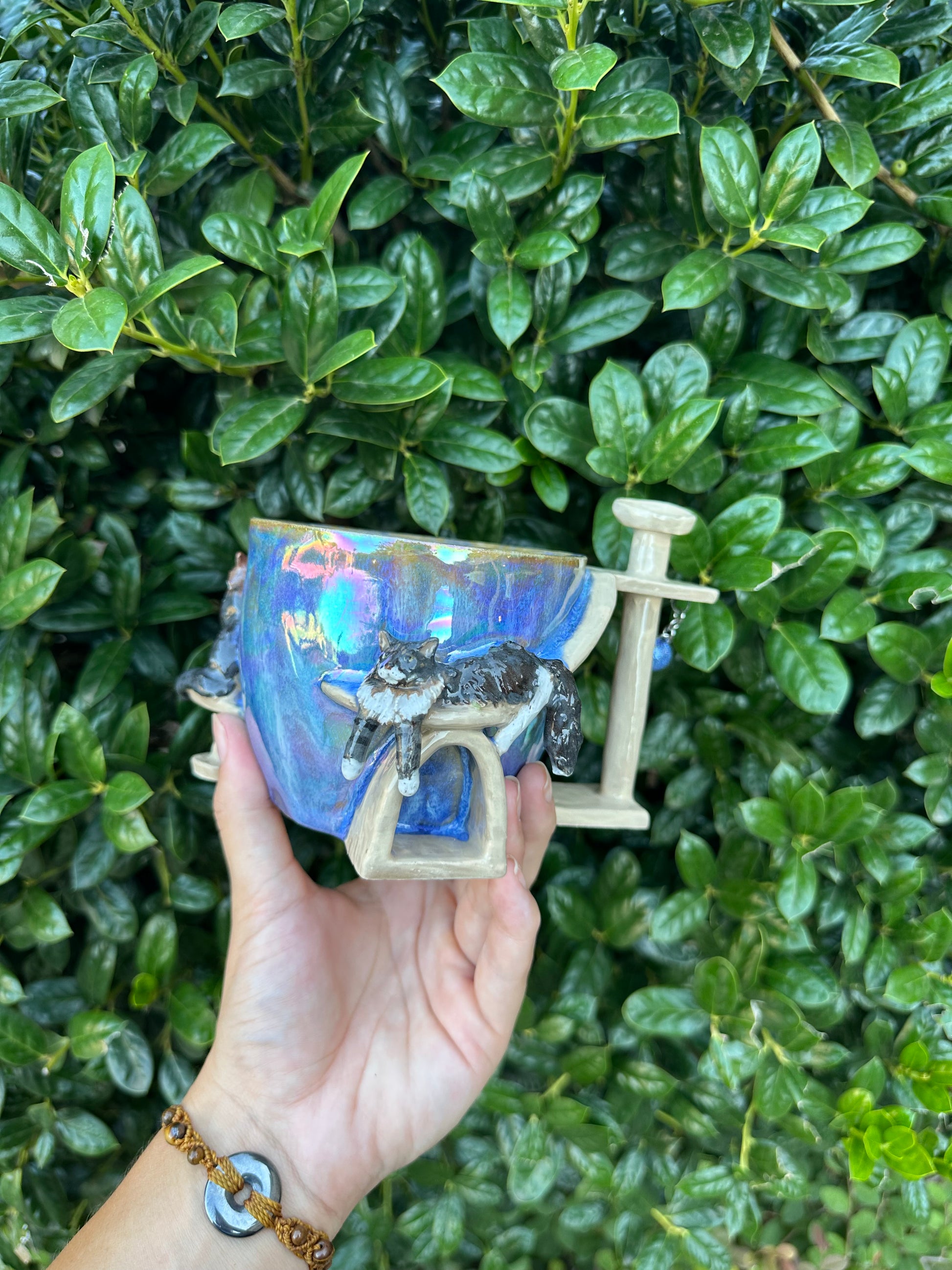 Since I have not made this type of mug yet I do not have reference pictures but the mug would have a cat tree handle with two cats around it and a dog on the side laying on a ramp! You can have up to 2 cats and 1 dog total for this mug!